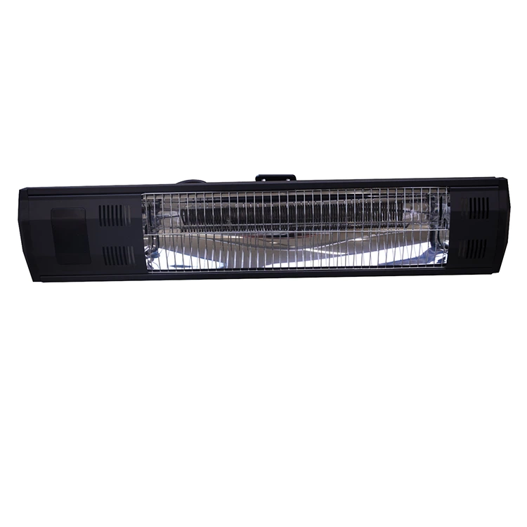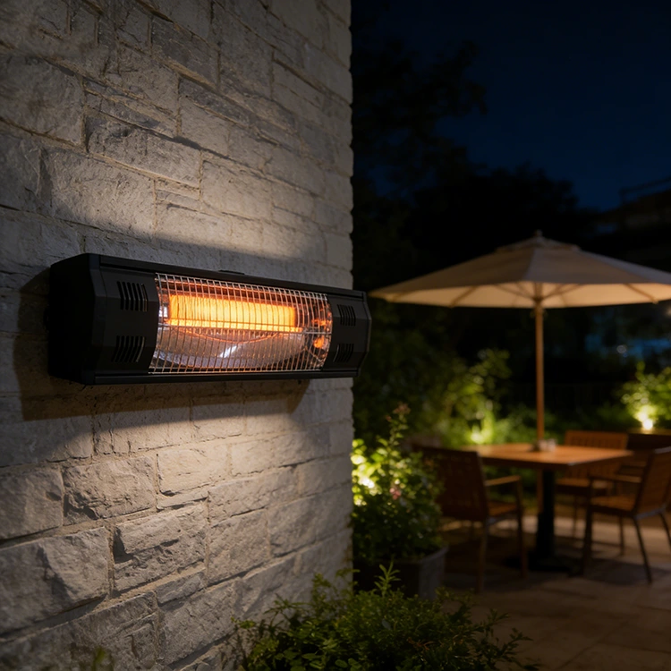 This wall-mounted quartz infrared radiant patio heater is a sleek, black, elongated outdoor heating unit designed for wall installation. It features a visible quartz tube at its core, which emits instant, focused infrared warmth, while its modern, low-profile casing integrates dual control options (remote and backlit touch panel) and a fully sealed, IP65-rated structure for all-weather durability. The adjustable mounting bracket allows directional heat output, and its compact, space-saving design blends seamlessly with any outdoor setting, delivering safe, silent, and energy-efficient heating for patios, balconies, restaurant terraces, and gazebos throughout the year.